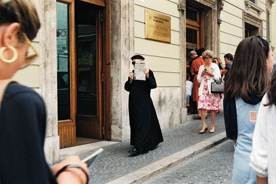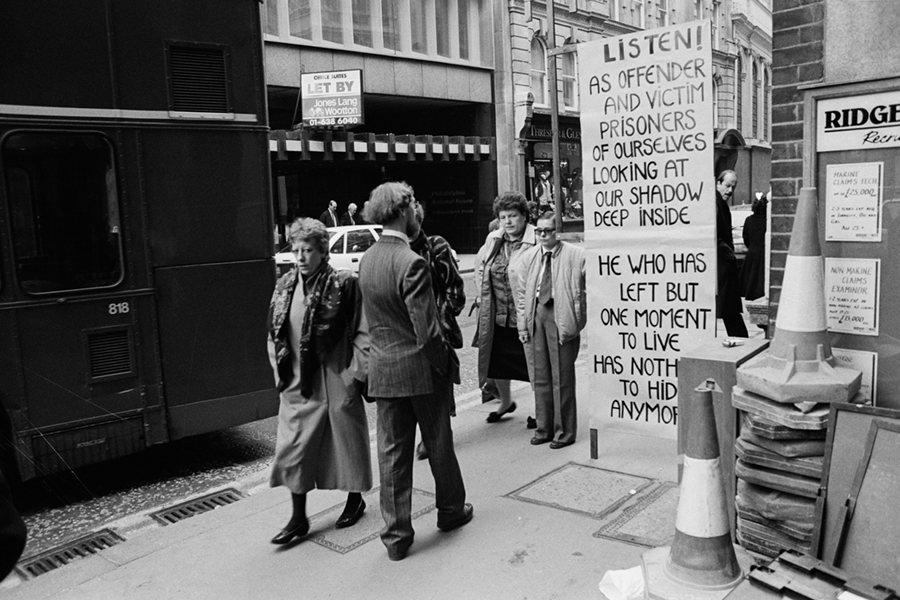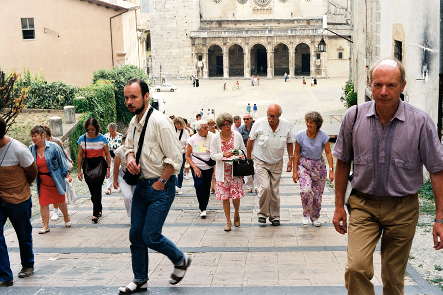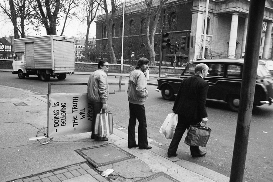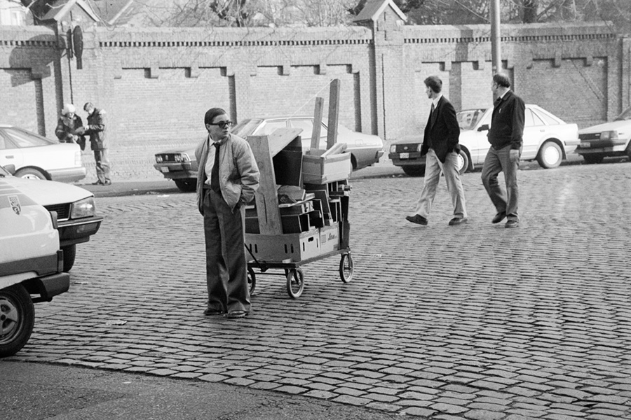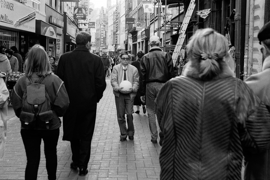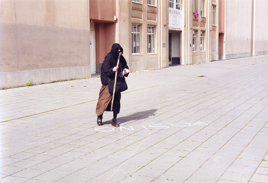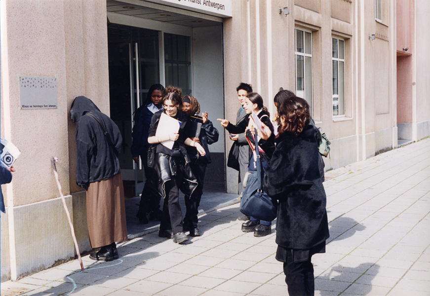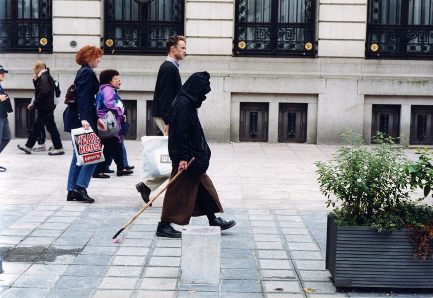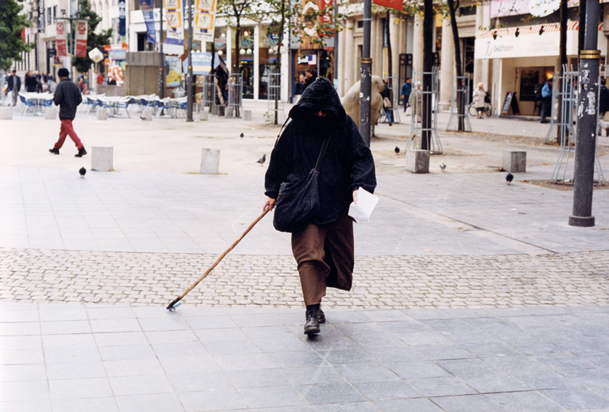 As a spectator (photographs and videos) of public life and as a participant (performances), Pacquée tries to find answers to the most elementary questions of existence. In this respect the street is her arena of study. She sees the street as a living setting, in which she moves discreetly (‘street rambling’), recording events from a particular viewpoint with a camera. Her interest in rituals and the metaphysics of religious experience, anonymity, city wandering and collecting of concomitant sounds and images – recreation and appropriation of reality by extracting details from their everyday context are also important themes in her work. Much is left to chance.